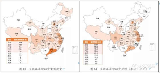 北京、上海、廣東仍為醫(yī)療健康產(chǎn)業(yè)的主要投資陣地,2018年完成融資的案例數(shù)量分別為164起、130起、94起,披露融資規(guī)??傆嫹謩e為145.9億元、263.1億元、70.5億元。浙江和江蘇繼續(xù)保持投資活躍,均有76起案例完成融資,披露融資規(guī)??傆嫹謩e為69.3億元和78.3億元。四川、湖北等省開始發(fā)力,完成融資的案例數(shù)量分別為23起和17起,同比2017年分別增長35.3%和41.7%。
