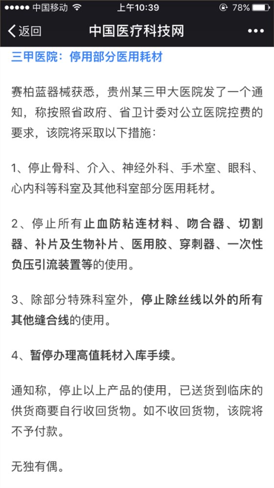 近期,網上一張截圖再一次引爆了醫(yī)療圈的“雷”,四川、貴州、山東等省份要求停用部分醫(yī)用耗材??梢钥吹桨ㄎ呛掀?、切割器、補片等耗材被禁止使用,手術縫合要求使用絲線,讓行內人士不無諷刺說,得了啥病別想著做手術了,吃點中藥、做個理療沒準就能好了!